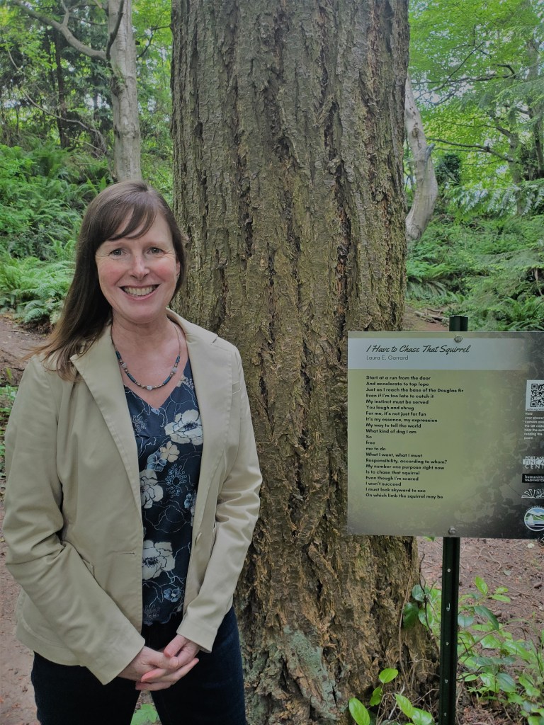 My poem below was selected, by the Olympic Peninsula Writers through a juried submission, to appear for a year in the PAFAC New Growth outdoors exhibit in the Webster Woods sculpture garden. Following a year, it will be moved with other poems to a number of parks in Port Angeles. It’s very exciting to have been chosen! Below is a photograph of me with the installation on the day of the poetry reading.