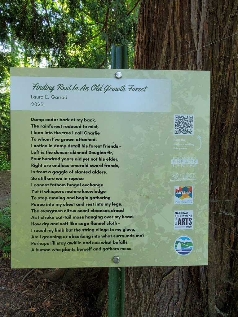 The Port Angeles Fine Arts Center and Olympic Peninsula Authors selected this poem of mine for their “Under the Canopy” 2023 Poetry in the Park outdoor exhibit in Webster Woods.