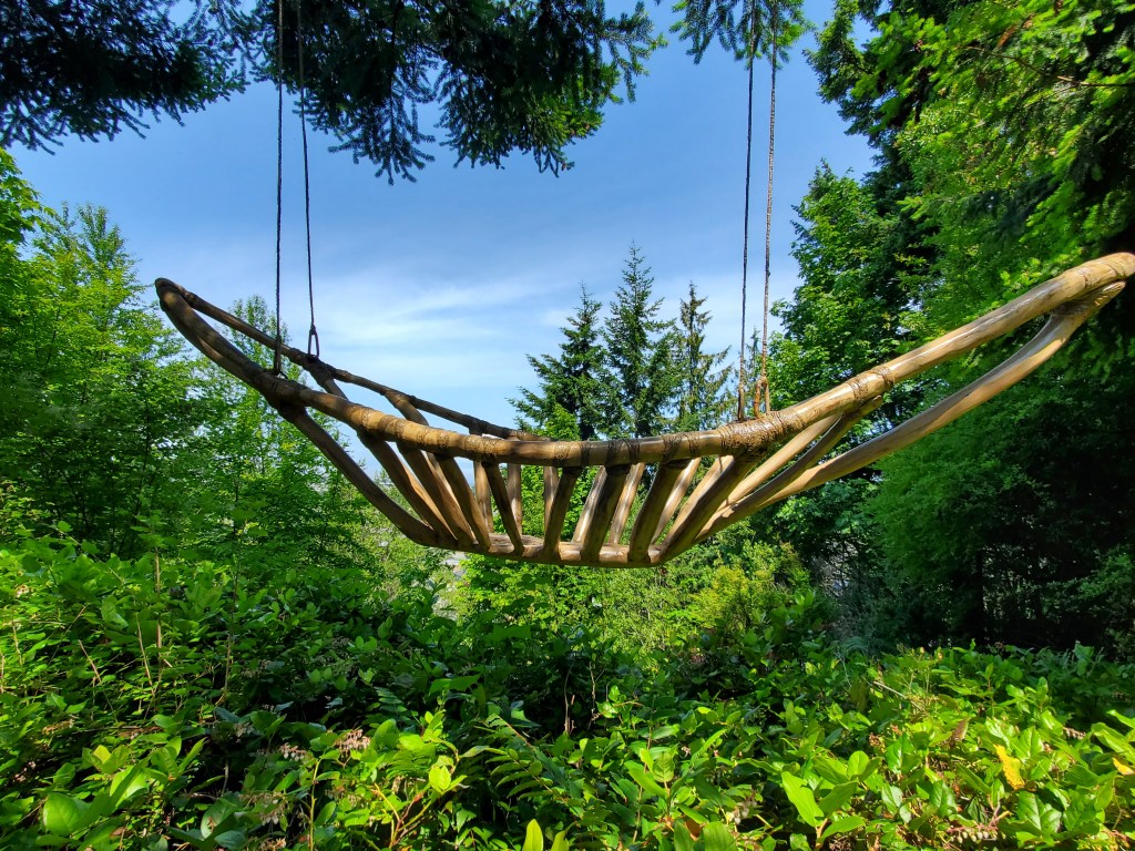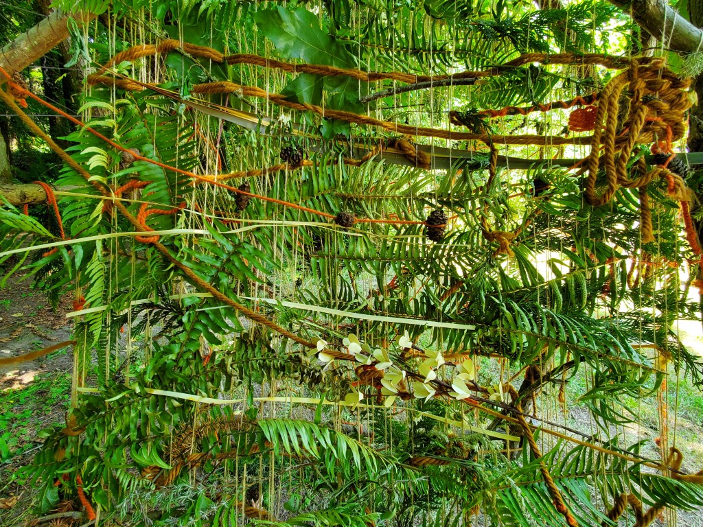 Artist credits for Webster Woods sculptures (top to bottom, left to right): Brandon Zebold, “Offering;” David Eisenhour, “Watershed Notes;” Micajah Bienvenu, “Pi a la Mode;” Steve Jensen, “Suspended Canoe Adrift;” Community Nature Weaving from Summertide 2023 with assistance from MarySue French; Steve Belz, “Sky Gazer;” Laura E. Garrard, “Butterflies Flurry While I Recline on ‘Sky Gazer’.”